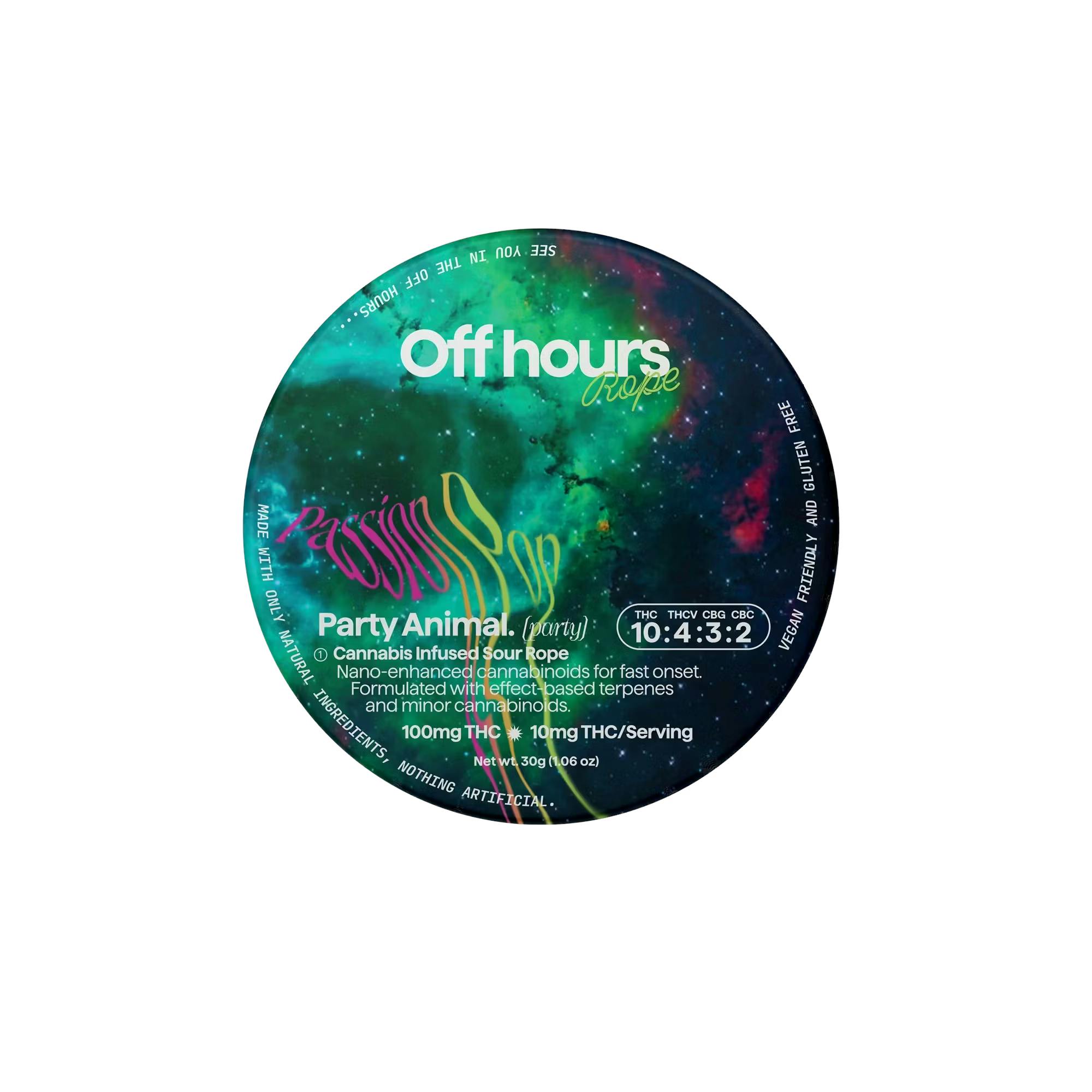 Off Hours | Sour Gummy Rope | Passion Pop | Party Animal-Party | THC:THCv:CBG:CBC 10:4:3:2 | 100mg