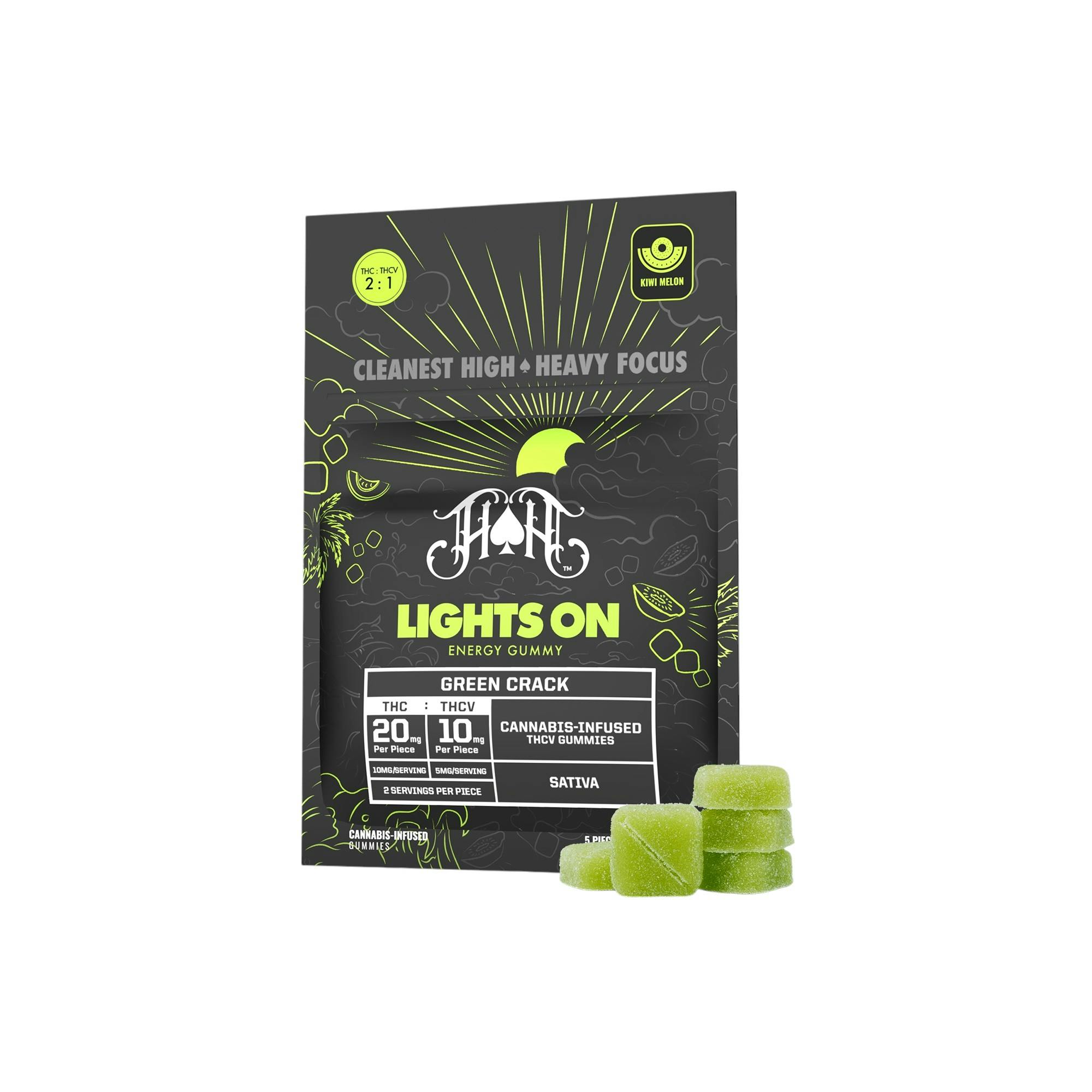 Heavy Hitters | Lights On Gummies | Green Crack - Kiwi Melon | 2:1 THC:THCV | Sativa | 5pc | 100mg THC