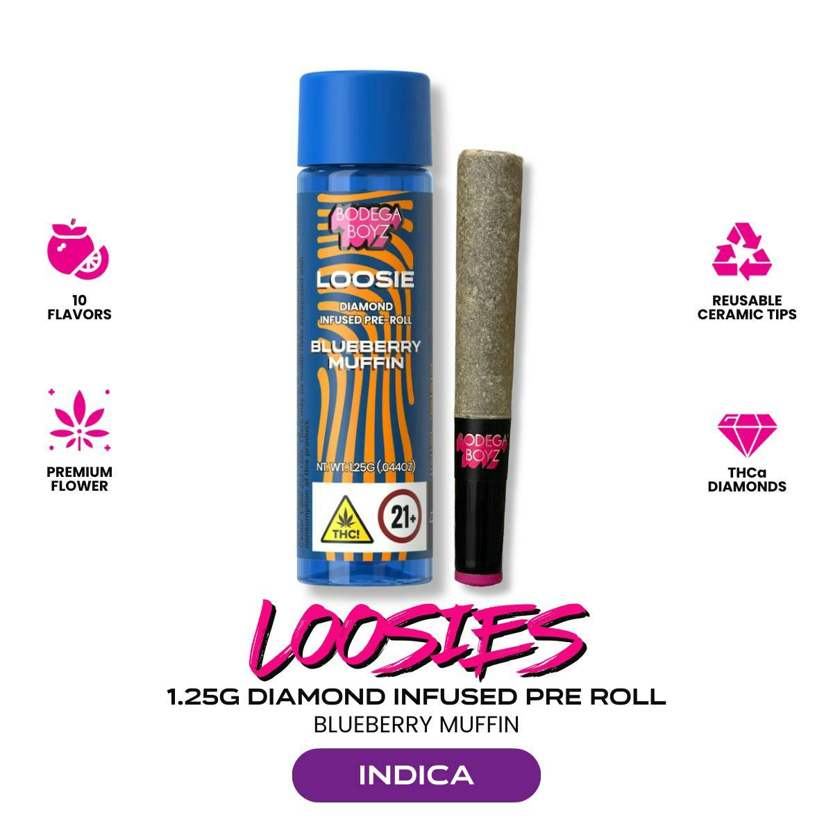 Bodega Boyz | Preroll | Blueberry Muffin | Indica | Loosie | Diamond Infused | Ceramic Tip | 1.25g
